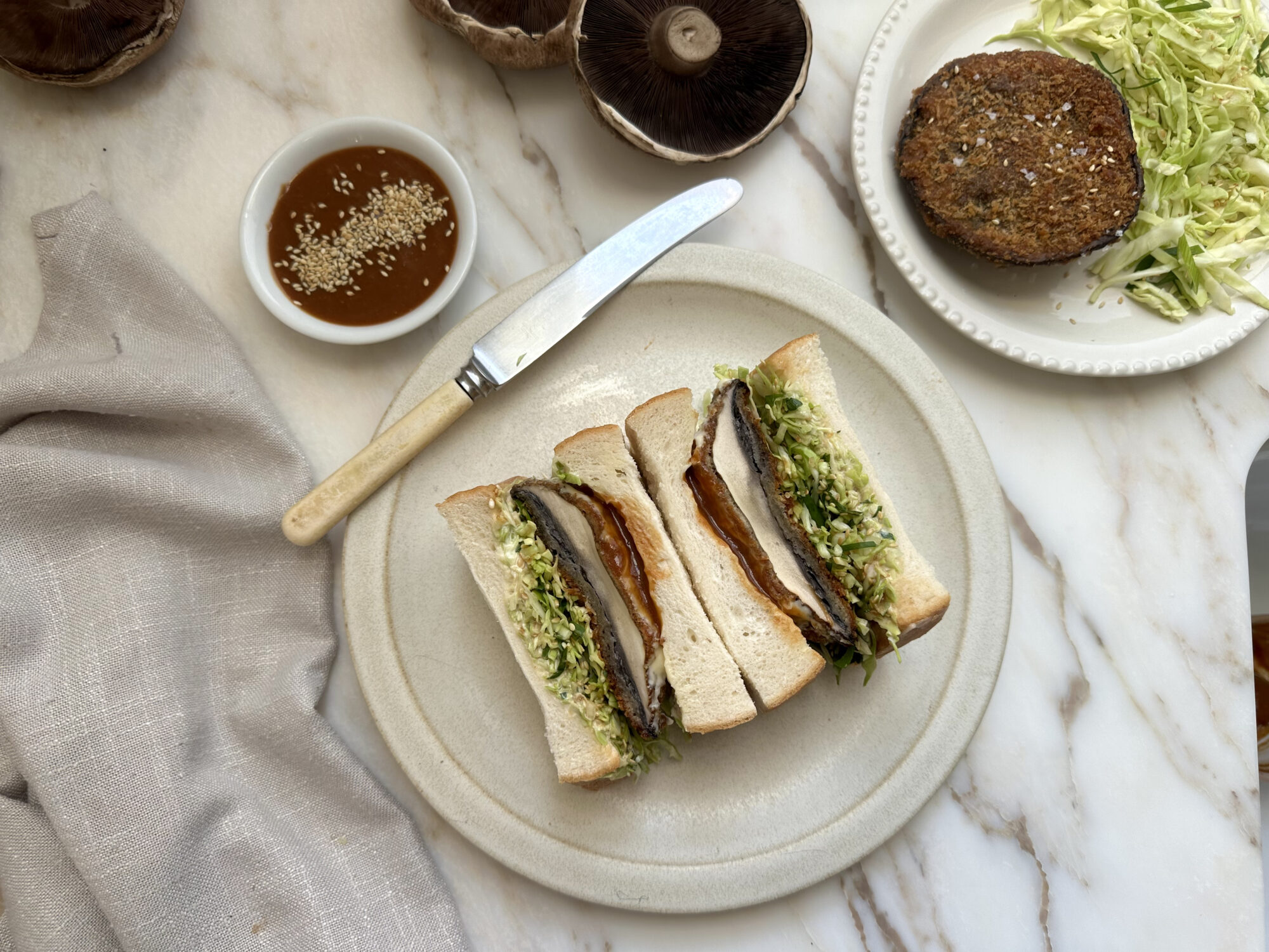 To assemble, Spread the kewpie mayonnaise onto 2 slices of the bread then spread the tonkatsu sauce onto the other 2 slices. Divide the cabbage mixture on top then add in the fried mushrooms. Place the other piece of bread on top then slice in half before serving.