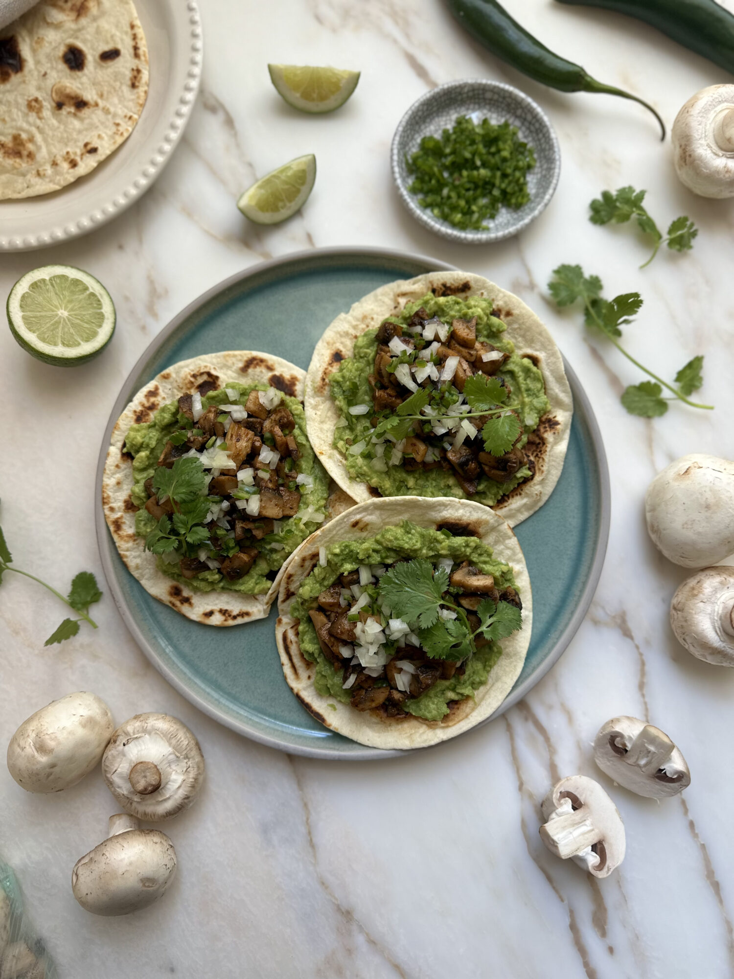 Spread the avocado onto the base of the tortillas. Spoon over the spiced mushrooms then scatter with diced onion, green chilli and coriander sprigs. Serve warm with extra lime wedges on the side.
