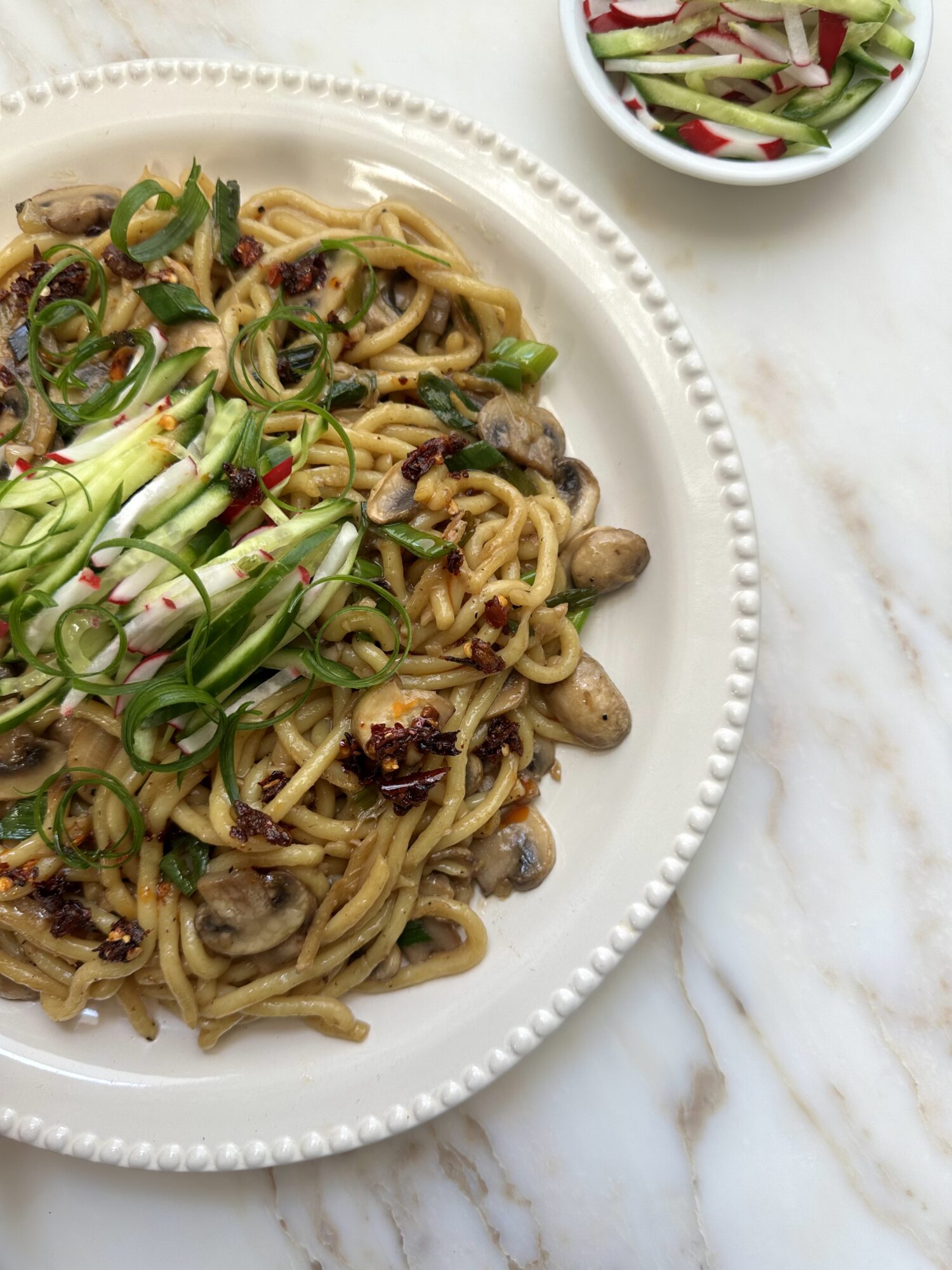 Place the noodles into serving bowls then top with the cucumber mixture and spoon over chilli oil before serving.